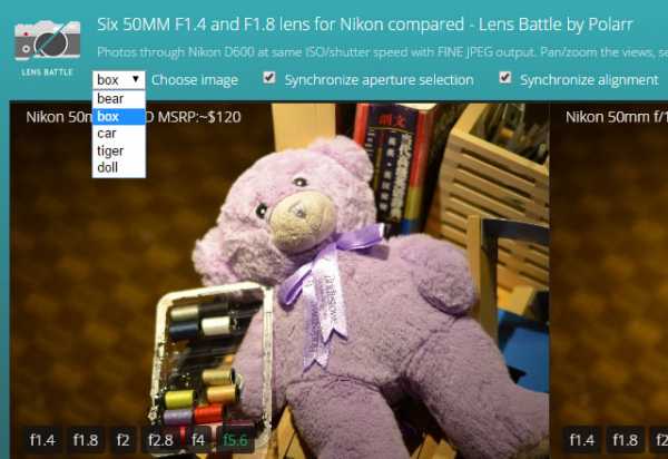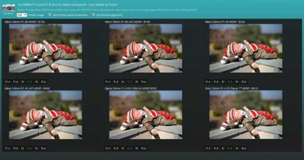 Сайт начинает со сравнения шести 50мм объективов для зеркалок Nikon: четыре Nikon, один Sigma, и один Zeiss. Каждый объектив можно проверить в пяти различных сценах на 6 различных значениях диафрагмы.
