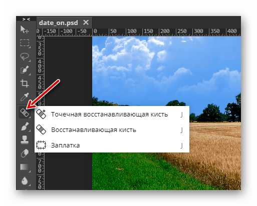 - К примеру, у вас есть красивая пейзажная фотография, но с небольшим дефектом — на ней отмечена дата съемки. В данном случае наиболее простым решением будет воспользоваться одним из группы восстанавливающих инструментов: «Точечная восстанавливающая кисть» , «Восстанавливающая кисть» или «Заплатка».