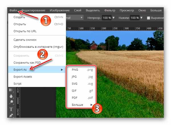 - Закончив работу с фотографией, экспортировать ее вы можете с помощью меню