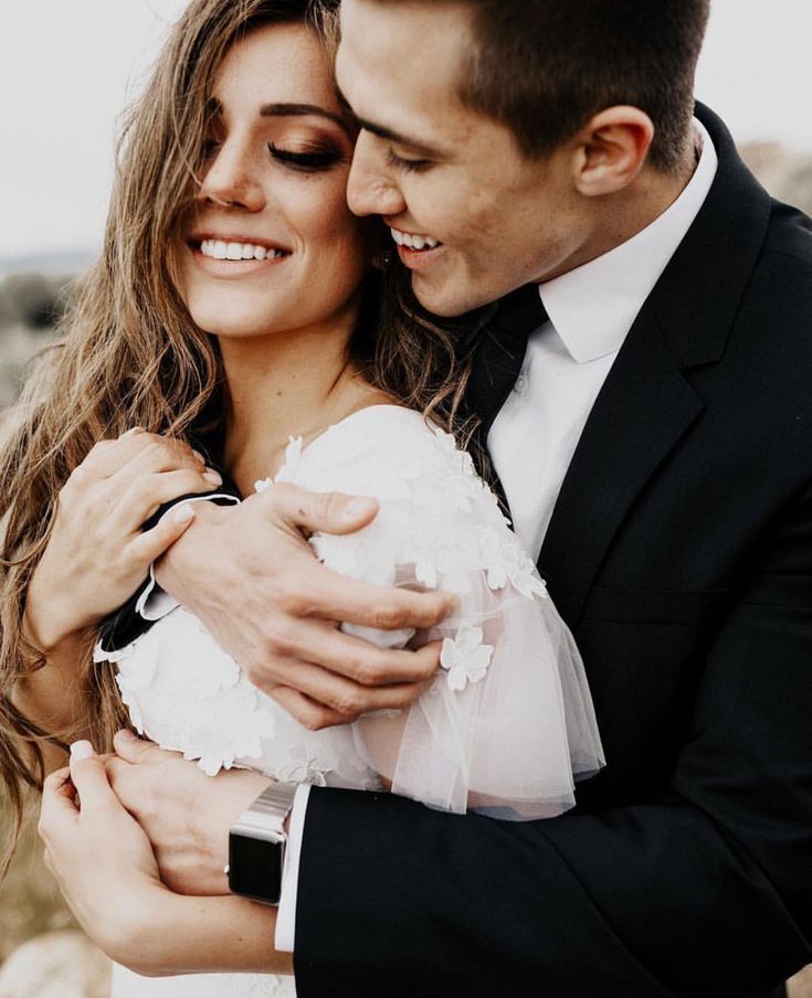 В этом снимке будет читаться послание: «Я за тобой как за каменной стеной». Жених будто закрывает невесту от всех невзгод, а она отвечает на это благодарностью.