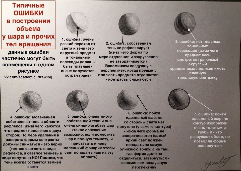 Итак, самый простой объект для разбора светотени- это шар(на фото посередине слева), на нем сразу же видно направление света, блик, светлые участки, собственную тень(тень на объекте), падающую тень(тень от объекта от самого шара) и рефлекс.