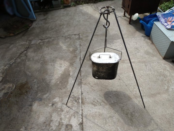Котелок подвешивают на крючки на разную высоту. Так уменьшают или увеличивают температуру. На треноге удобно готовить в круглом котле со сферическим дном.