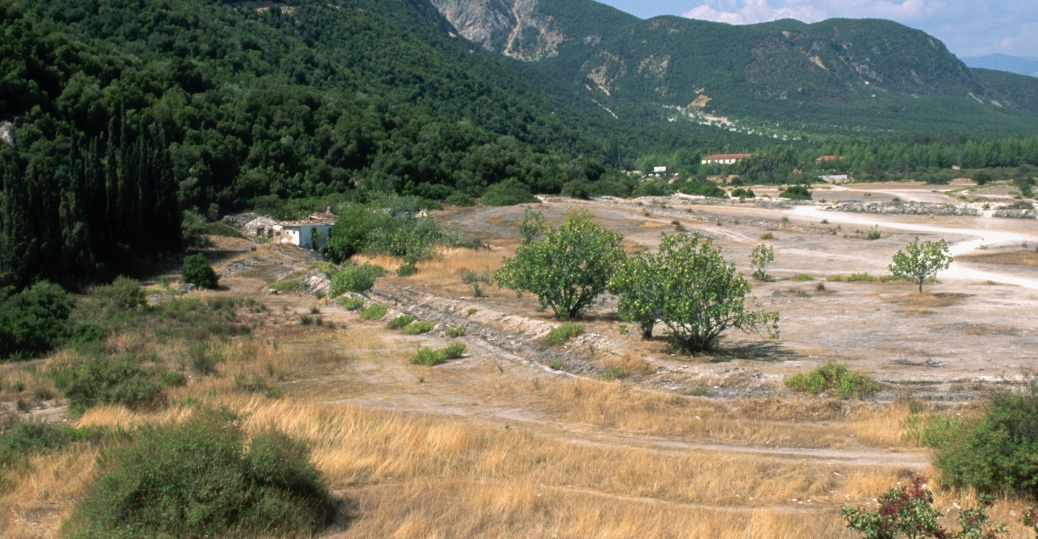 Современный вид Фермопильского прохода в месте сражения. Береговая линия отодвинулась далеко от гор.