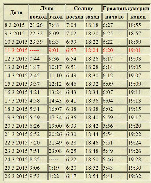 | 26 | Сб | 08:06:28 | 15:57:18 | 07ч 50м 50с |
