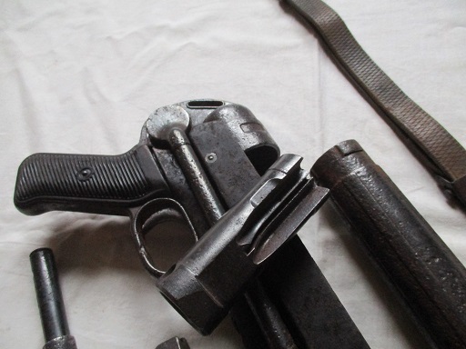 7.62 MM KOROBOV TKB-517 PROTOTYPE SUBMACHINE GUN После неудачи с автоматом ТКБ-408, скомпонованный по схеме «буллпап», конструктор Герман Коробов продолжил работы над оружием по схеме полусвободного затвора. Следующими образцами в линейке стали автомат ТКБ-517 и созданный на его базе ручной пулемет ТКБ-523, отличавшийся большей длиной ствола, прикладом и емкостью магазина. К 1955 году автомат ТКБ-454 после ряда доработок и испытаний в ЦКБ-14 и НИИ-61 был представлен на конкурсные испытания под индексом ТКБ-517. ТКБ-517 представлял модернизированный образец ТКБ-454-7А, который успешно прошел заводские и полигонные испытания еще в 1952 г. и был рекомендован для проведения войсковых испытаний на курсах «Выстрел». На проводившихся в 1953 г. в Солнечногорске. НИИ-61 и СТК испытаниях автомат получил положительные оценки, превосходя облегченный автомат АК во время стрельбы непрерывным огнем лежа с упора малотренированными стрелками в 1. 3–1,9 раза.ТКБ-517 выполнен на основе автоматики с полусвободным затвором. Затворная группа состоит из лёгкого затвора и более тяжелой затворной рамы. На затворе установлен двуплечий рычаг, нижним плечом при закрытом положении затвора упирающийся в ствольную коробку, а верхним — в затворную раму. В момент выстрела пороховые газы начинают давить на дно гильзы, двигая её назад в патроннике, из-за чего она давит на зеркало затвора. Верхнее плечо рычага приводит затворную раму в движение. Из-за разницы плеч непосредственно после выстрела затвор движется медленно, в отличие от затворной рамы. К тому моменту, когда давление в патроннике снижается до безопасного уровня, рычаг-замедлитель выходит из зацепления и дальше затвор с затворной рамой, сжимая возвратную пружину движутся вместе. Стреляная гильза извлекается и выбрасывается, а когда затворная группа идёт обратно, в патронник подается новый патрон. Рукоятка затвора неподвижно закреплена на затворной раме справа. В конструкции УСМ имеется автоспуск, который играет роль межциклового замедлителя и позволяет успокаивать колебания оружия. УСМ позволяет вести огонь как одиночными, так и непрерывными очередями. Предохранитель-переводчик расположен над спусковой скобой с правой стороны ствольной коробки. Открытый прицел с качающимся целиком фиксировался по лункам на стенке ствольной коробки, позволяя стрелкам выставлять требуемую дальность на слух (по щелчкам).Ручной пулемёт ТКБ-523 отличался большей длиной ствола, формой приклада и ёмкостью магазина. В январе-феврале 1957 года состоялись испытания, в ходе которых автомату ТКБ-517 противостоял автомат Калашникова модернизированный. Образец Коробова имел преимущество по кучности, в следующем году оба автомата были отправлены на доработку. Доработка и испытания ТКБ-517 были признаны нецелесообразными, поскольку автомат Калашникова был освоен в производстве и проверен в войсках, что упрощало принятие на вооружение его модификации. «Несмотря на превосходство ТКБ-517 над АКМ по многим показателям, в том числе по кучности стрельбы и вдвое меньшей трудоемкости, предпочтение на аппаратном уровне было отдано не более удачному автомату Коробова, а проверенному несколькими годами эксплуатации в войсках автомату с газоотводной схемой». «Системы с полусвободным затвором как нетрадиционные для СССР были отвергнуты, поскольку совершенно необоснованн