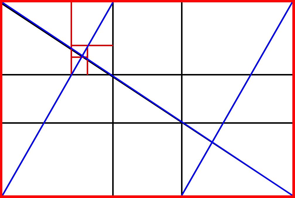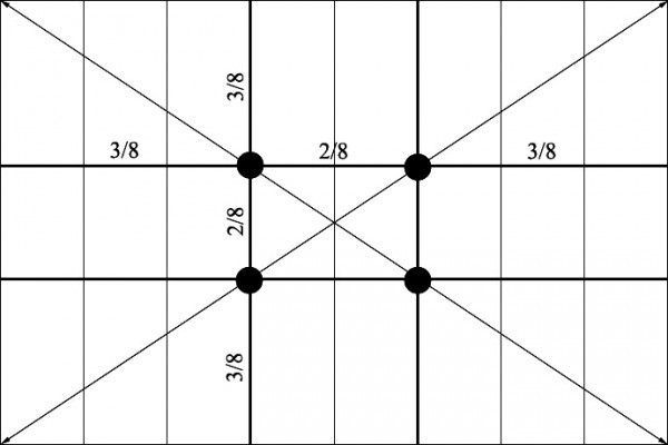 Кроме того, на пересечении линий золотого сечения находятся особые зрительные центры. Они расположены на расстоянии примерно 3/8 и 5/8 от краев изображения.