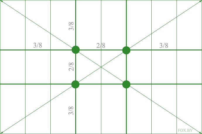 Кроме того, на пересечении линий золотого сечения находятся особые зрительные центры. Они расположены на расстоянии примерно 3/8 и 5/8 от краев изображения.