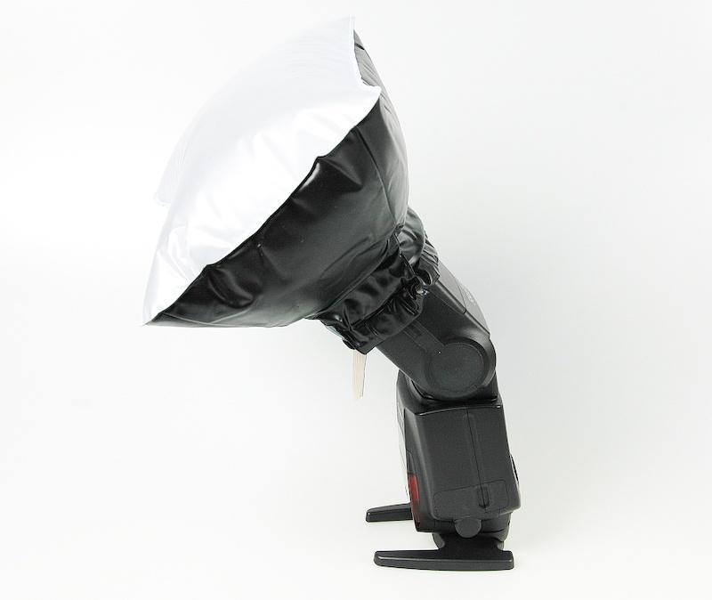 Надувной рассеиватель на внешнюю вспышку привлекает фотографов небольшим весом и компактностью. Маленький софт бокс крепится на головку накамерной вспышки при помощи гибкого шнура. Простота и скорость крепления на камере – характерная особенность устройств этого вида. Мягкое равномерное освещение объекта съемки с размытыми тенями за ним дает использование вспышки с углом наклона головки 45 градусов и закрепленным диффузором.