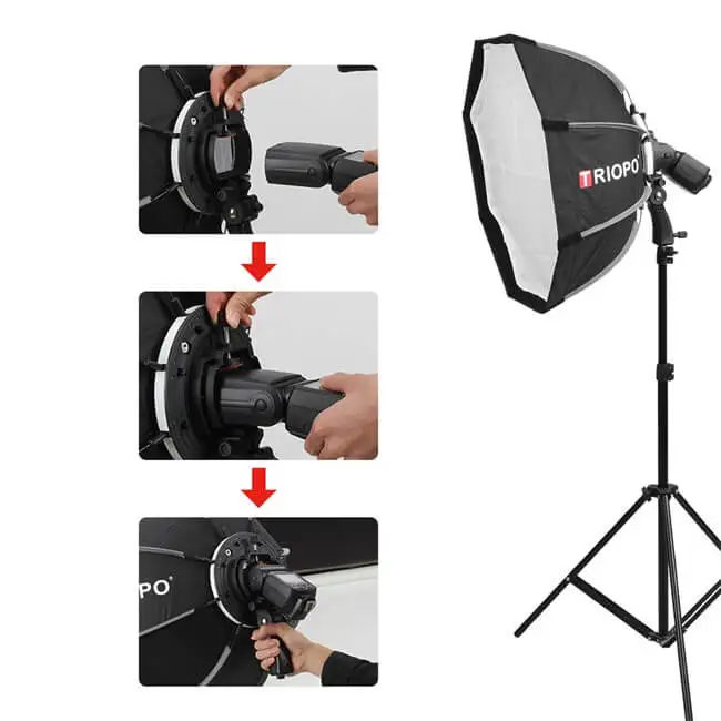 Крепление софтбокса на вспышку может быть двух видов: непосредственно на ее головку или при помощи специального кронштейна на стойку.